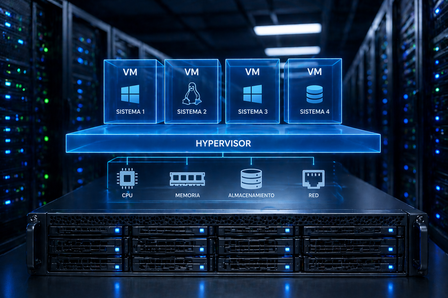 - Consolidación de Servidores: Reducción de hardware físico mediante virtualización.